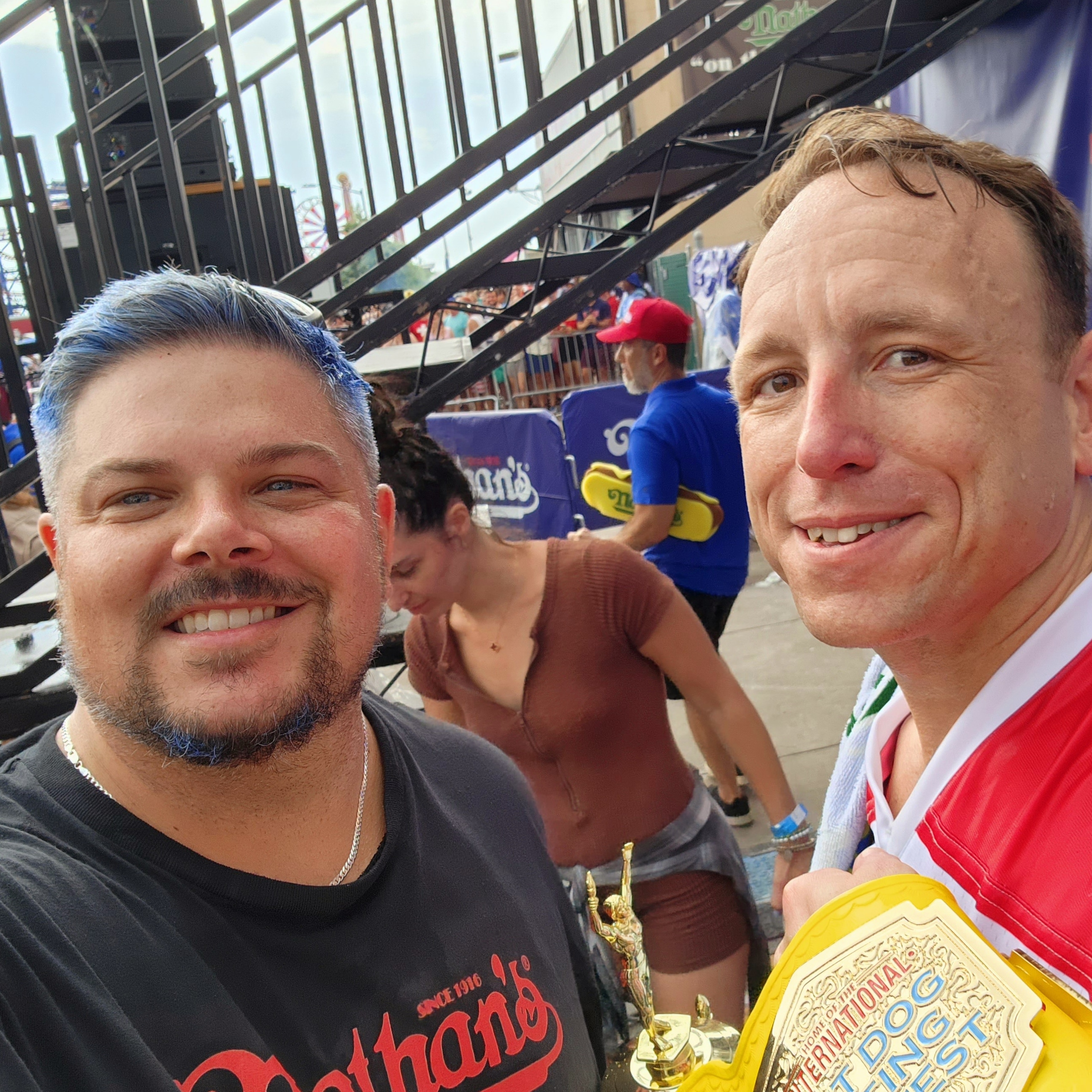I’ve been around. NYC. Coney Island. Court…BBALL! I recently returned from a huge trip to Nathan’s Famous 2022 for the Hot Dog Eating Championship. I became a Pro Eater in 2007 with Major League Eating. I’ve been in and out of the stomach-centric sport, but a return to the table was immanent. Then, YouTube Legend Eric Badlands Booker went LIVE and selected me, Cameron “CONSUMPTION” McKirdy to be in the Chugging Contest against him…